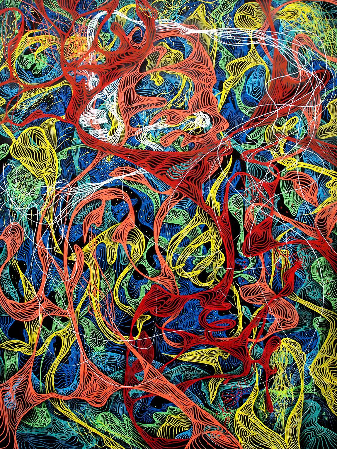 Tribal Moovin is a live painting piece from Ozora festival 2018, and part of the artists' “new anatomy research”, a study in abstract form that represents for Awer a view of the human mind in micro detail. This artwork is a stereoscopic depth experiment, and can also be viewed with old school red/blue 3D glasses.