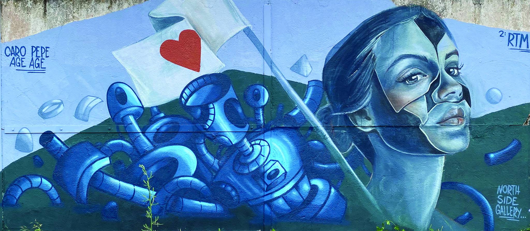 Created at North Side Gallery, Berlin-Mitte, as a collaboration with the Berlin artist, Age Age, “Evolution of Love” no longer exists in situ. This piece, dominated by a strong palette based around ultramarine and Prussian blue, seems to describe a collision (or coming together) of a robotic form and a classic Pepe face; around a white flag emblazoned with a red love heart. The subject is that of rising above adverse circumstances and an ode to the power and resilience of the human spirit.