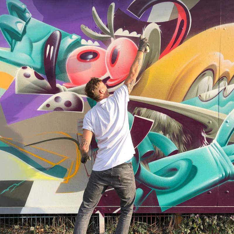 “To understand my work, you need to know where I come from. I grew up in the East Berlin suburbs. If you drive through Marzahn today, everything is beautiful and green and the houses are renovated and brightly painted. The early ‘90s, on the other hand, were characterized by grey dreariness. The place was a huge concrete desert. After the euphoria of the reunification faded, mass unemployment, violence and shattered dreams remained. It was around ’93 or ’94 when I noticed the first splashes of color on our Plattenbau buildings. Some strangely shaped, colorful letters that suddenly adorned the facades captivated me. Once, we saw a graffiti sprayer. I watched him for hours, totally fascinated. Of course, we also dusted off his empty cans. Later, we got ourselves a few cans and started spraying all over the place. This subversive, anarchistic idea of graffiti had grabbed me. If the world is too grey for you, then make it colorful.”
