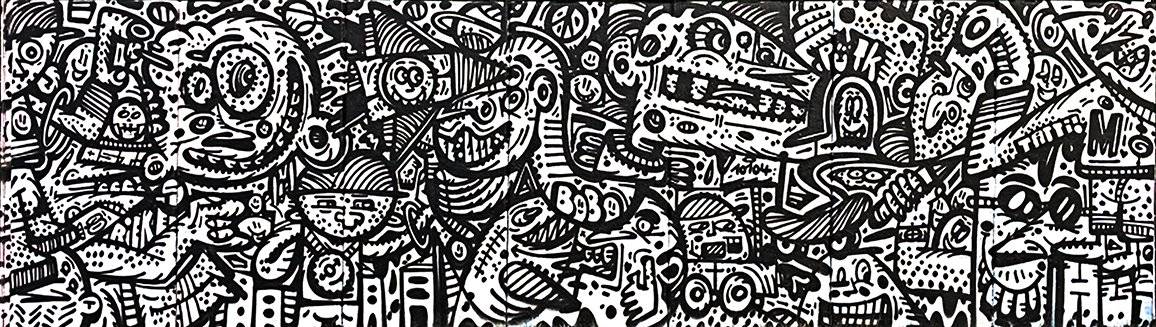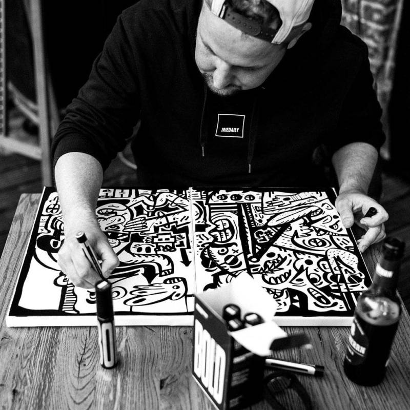 Over recent years, HÜLPMAN has created murals and customized textiles including sneakers and caps, and taken part in various solo and group exhibitions, battles and festivals in Germany, Italy, Israel, and New Zealand. Based on a clear and strong line and a command of subject matter, HÜLPMAN’s work is often direct and playful, and boasts strong narrational qualities. His clear, rich line lends itself to decoration over a number of formats and situations; as seen with the designs for everyday items we use, such as coffee beakers, skateboards or clothing. The name HÜLPMAN is apposite; Hülpüsch is an accessible, “people’s” artist who involves himself in the wider graphics community, giving many workshops and teach-ins.