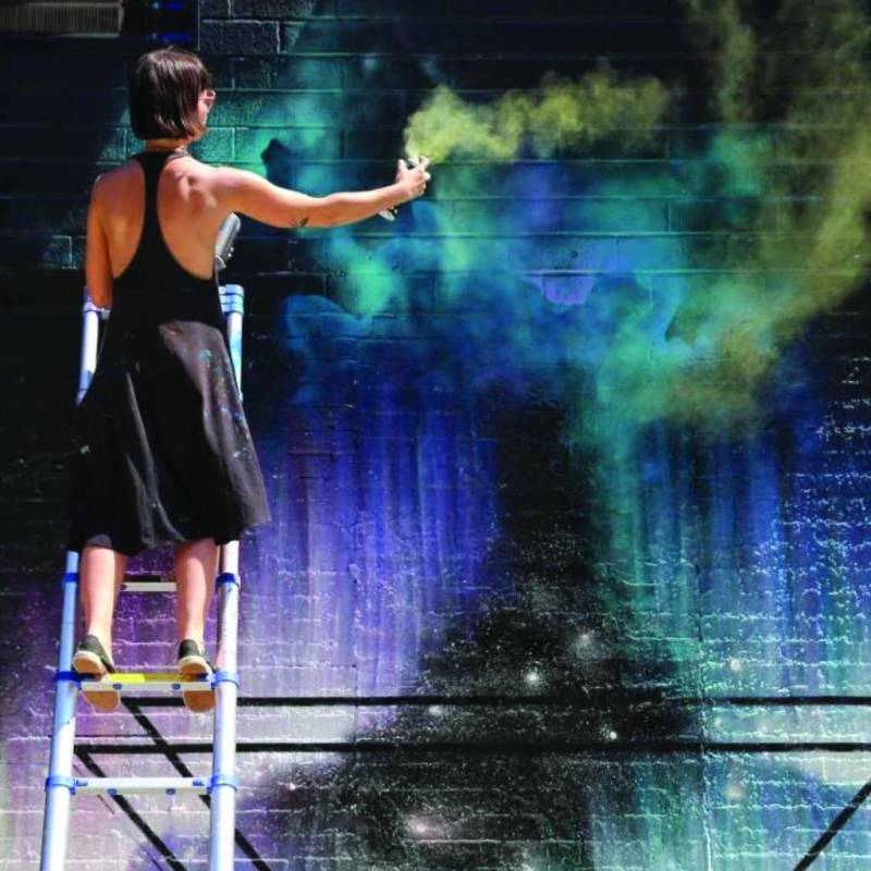When working with graffiti in her unique technical style, she creates delicate and gentle images, both on walls and in her studio works. SunSet SunRise, created in 2021, is a spray painted fine art piece that radiates with summer vibes. The smooth gradient, sharp edges, and the translucent interrupted column suspend us for a moment in the surreal. The column here symbolizes the breaking point or break through with your own patterns, beliefs, with an invitation to take a leap into the light...