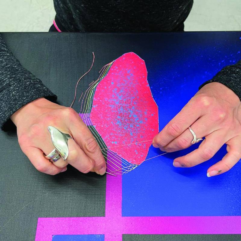 Marina Zumi is a Argentinian multi-interdisciplinary artist who originally worked in South American Neo-Muralism, painting nature themes in contrast to the polluted streets around her. Zumi began experimenting with textiles in her studio, where she developed a self taught hand embroidery technique for canvas, linking mathematics and sacred geometry into her work.