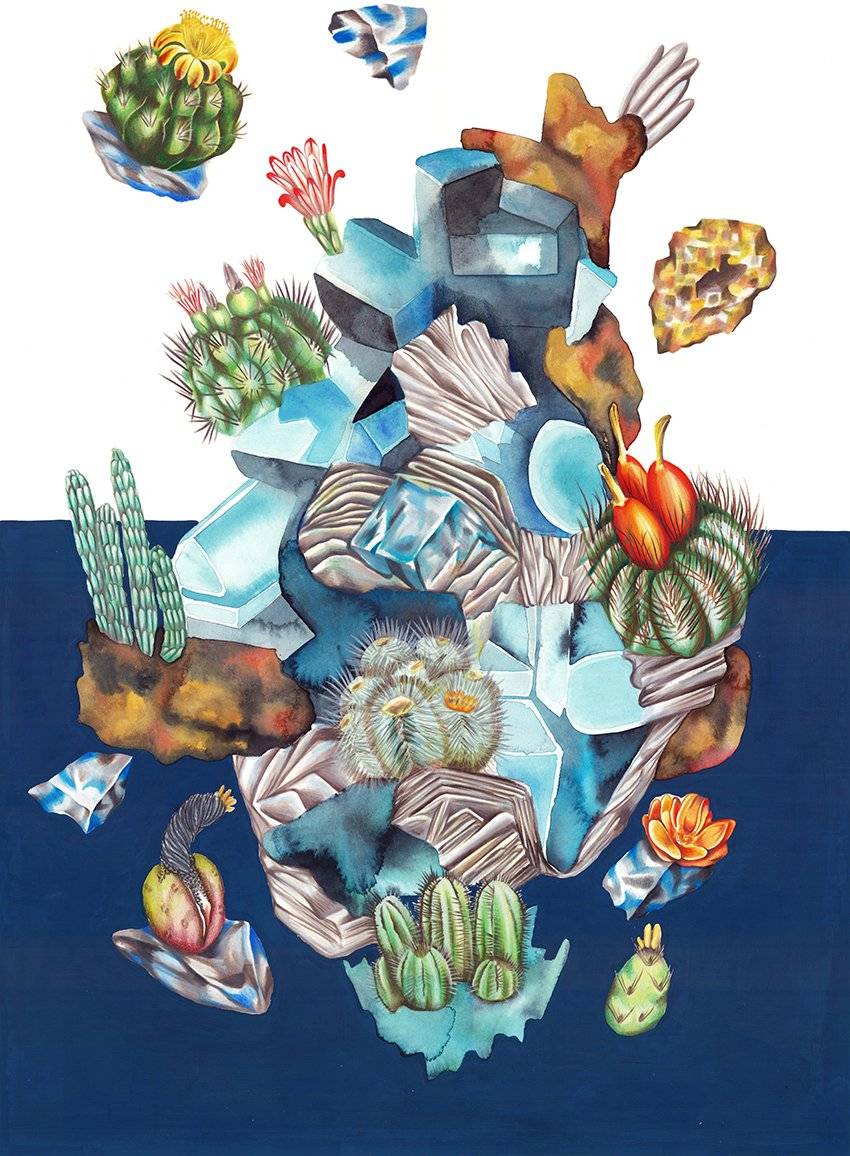 The artworks Black Island and Pan de Azucar are taken from the Series Mountopia inspired by two magical places from her own life: The Andes, Chile, and the Swiss Alps near her adopted hometown of Geneva. Rock, minerals and plants merge to form new imagined worlds