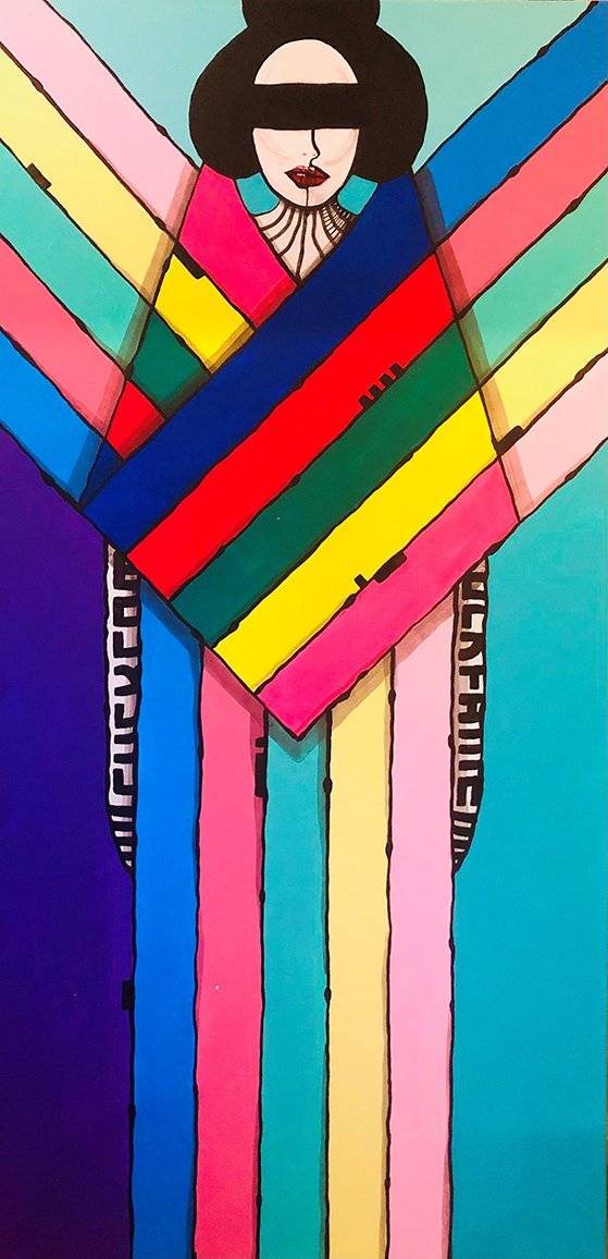 Geisha plays a major role in most of the works, representing this post-modern cosmopolitan urban figure with various identities, depending on the context and situation.They evolved to stay the concept of her being limited and even prohibited to self-express her uniqueness and individuality, in contract to the obsession with self-expression and individuality in the West. Currently, the Geisha character is more of a trademark, a feature that they use to create recognition of their work. The motto ‘FUCK FAME’ is used with irony and a hint of provocation, pointing out the paradoxical nature of the concepts behind fame, popularity, and influence in the era of neo-liberalism, commodification and digitalization of art and culture, and the never-ending trend-setting activities on social media.