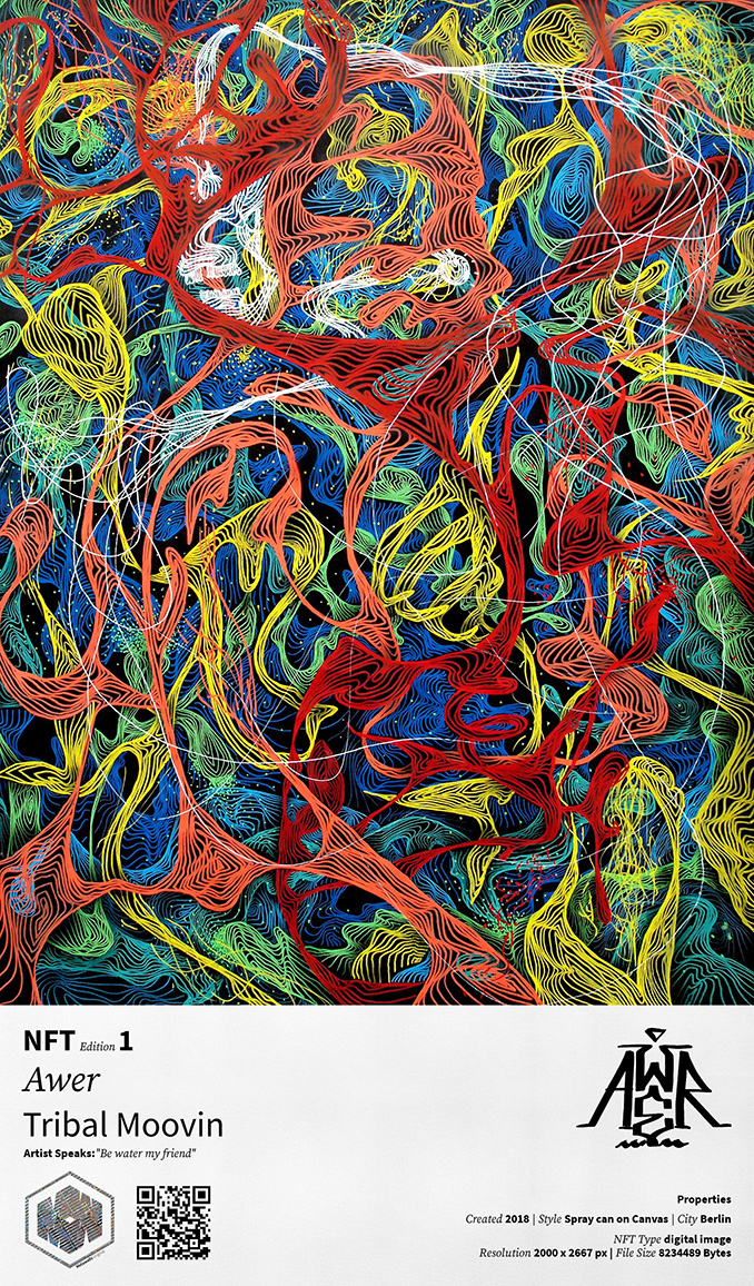 AWER's works have been described as hypnotic graffiti, introducing us to possible new worlds, occupied by mythological characters and mesmerizing creatures, formed of vibrant line based imagery. Aiming to distract the passer-by from their boredom of everyday activities, he offers a sensory escape of the mind, free from all its troubles, as an artistic remedy to the known reality. Optical illusions fill the murals and artworks of AWER, proposing a connection with a higher universal power, inviting you (according to the artist) to interpret in a personal way.