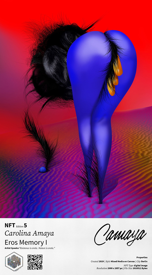 To emphasise this unusual effect, Amaya employs a palette of saturated colours and juxtaposes textures of organoleptic origin. This is why all her works should be seen as one. From drawing to installation, digital, painting or the creation of objects: all explore the same topic from different dimensions. This series of digital paintings reflect on the decision-making process between virtual sexual fantasies and physical contact.